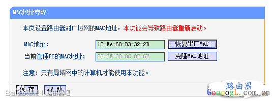 然后点击“克隆MAC地址”,保存后路由器自动重启,重启完成后仍然不行,将上面步骤重复一边还是不行。最后在“LAN口设置”处更改路由器IP地址为“