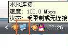 在电脑上插上USB网卡,安装好驱动,连接网线,发现电脑上网正常,说明网线没问题。那么可能是网卡有问题。 关机,再次拔下网卡,反复检查网卡,没发现异常。因此怀疑插槽金属片氧化,于是找镊子轻轻来回刮几下,再插上网卡。开机进入系统,这次电脑桌面右下角顺利显示正常的网络连接图标——两台小电脑(如下图),电脑上网正常,故障排除。