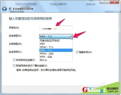 3、网络名(ssid)就是你的无线名称,输入你的无线名称,选择安全类型(同路由器)