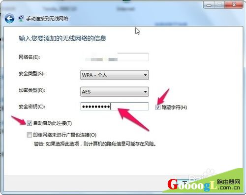 5、安全密匙输入密码(隐藏字符)-钩选-自动启动此连接-下一步-连接创建OK