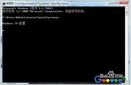 在命令提示符中输入“ipconfig /renew”,按下回车键,重新获取新的ip地址