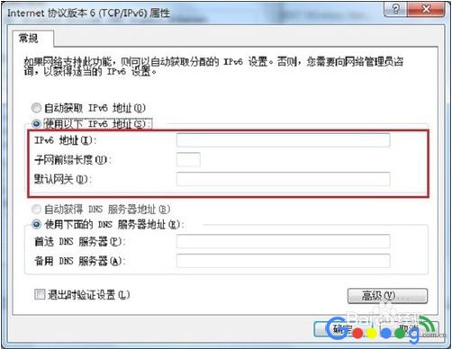 第四步将自动获取ip地址改为“使用以下ipV6地址”,在下面输入与路由器不同的ip地址就完成了