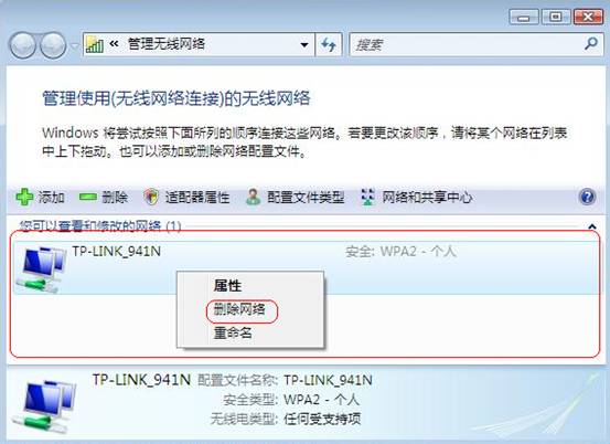 “网络和共享中心”-“管理无线网络”,将其中内容清空。
