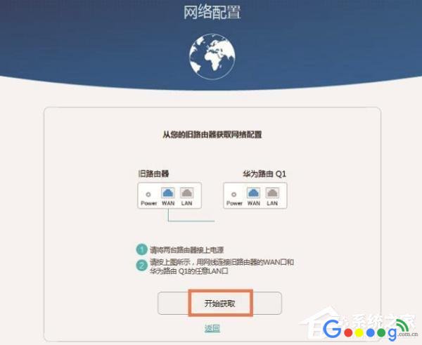 点击“从旧路由器获取”准备一根网线,一头连接旧路由器的WAN接口,另一头连接华为路由Q1的LAN接口——》然后点击“开始获取”