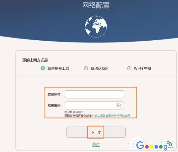 2、设置上网此时华为路由Q1会自动检查用户的上网方式,如果检测到上网方式是:“宽带帐号上网”,在下面填写运营商提供的“宽带账号”、“宽带密码”——》点击“下一步”。