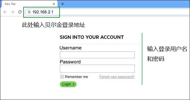您必须输入管理员用户名和密码才能访问贝尔金路由器控制台。建议您在设置路由器时就更改此信息。
