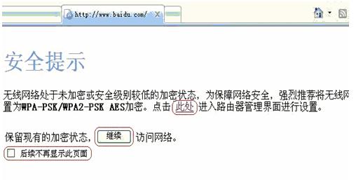 同时如果当前无线设置加密类型为非WPA-PSK/WPA2-PSK AES 加密,您打开网页时会弹出如下界面: