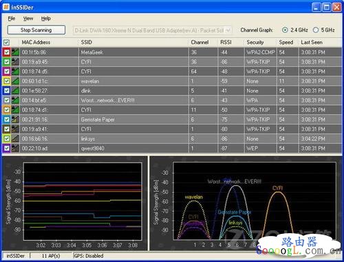 解决的方法也很简单,更改信道频段就可以了,但是我们怎么知道哪个信道不冲突呢?我们可以使用InSSIDer这款软件来实现,可有轻松把周围的路由器信息监测出来,找到信道这一项就可以了。