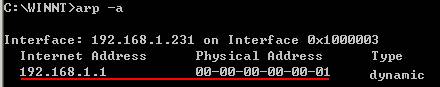 b、如果您在命令行提示符中输入:arp -a,看到网关对应的MAC地址不是路由器的LAN口MAC地址,则是有arp欺骗发生了。如下图。