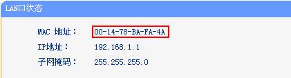 确诊: a、登陆到路由器上,查看运行状态――LAN口状态, 上面有路由器的MAC地址信息;
