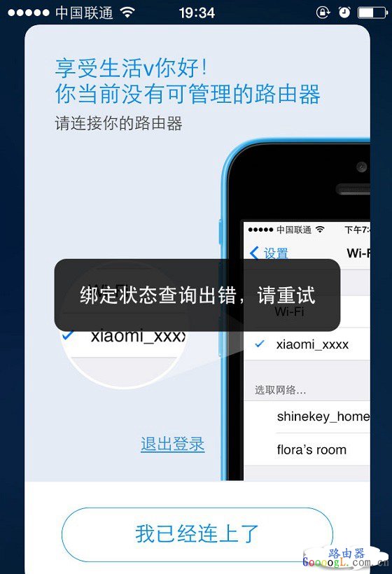 1、在小米路由器绑定小米账号,如果遇到绑定状态查询出错,请重试的提示,大家可以都试几次,另外检查一下网络是否正常,绑定过程是需要在有网络前提下的。