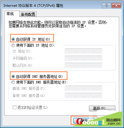7、选择“自动获得 IP 地址”和“自动获得 DNS 服务器地址”,单击“确定”。