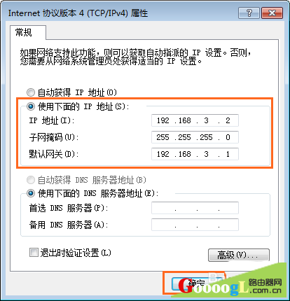 8、如果您关闭了路由器的 DHCP 服务器,则计算机将无法自动获取 IP 地址,请手动设置计算机的 IP 地址,使其和路由器的IP地址在同一网段(如:192.168.3.2)。