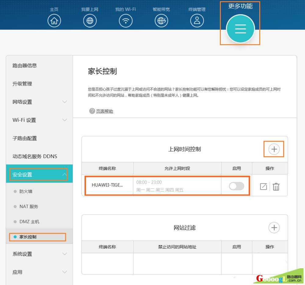 3、进入“更多功能 > 安全设置 > 家长控制”页面。检查不能上网的那台电脑是否在“家长控制”的终端列表里。如果是,请关闭或删除家长控制规则后,重新尝试是否可以上网。