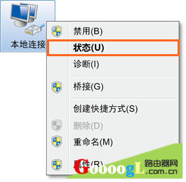3、单击“更改适配器设置”。右键单击本地连接,选择“状态”。