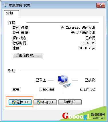 5、若 IP 地址和路由器的 IP 地址不在同一网段,则在“本地连接 状态”对话框中,单击“属性”。