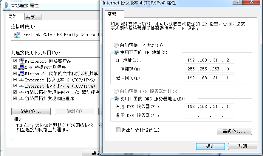 或者从子网192.168.31.x静态注册iP地址,并通过网关指定网关,如下。