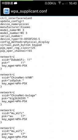 找到wpa_supplicant.conf文件,打开这个文本,你所连接过的WiFi密码都记录在这里。。