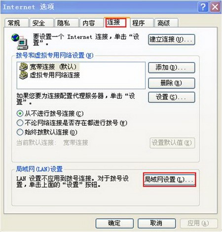 浏览器里面的工具—-Internet选项—-连接,如下图: