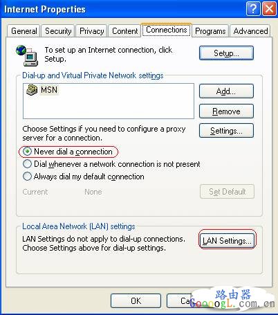 1,点击启动 Windows任务栏上按钮,然后单击控制面板,选择Internet选项并双击它,切换到连接选项卡,并选择从不进行拨号连接。