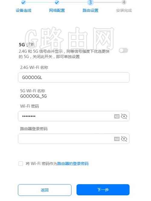 双频路由器有2个无线WIFI名称和密码;并且你可以勾选管理员密码与WIFI密码相同按钮。这样就不用记住2个复杂的密码而烦恼了。