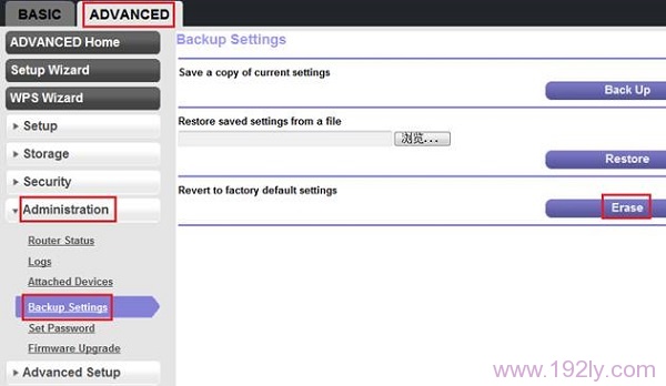(2)、高级>管理>备份设置>擦除(ADVANCED>Administration>Backup Settings>Erase)