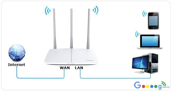 注意:宽带线一定要连接到路由器WAN口,电脑连接在任意一个LAN端口。