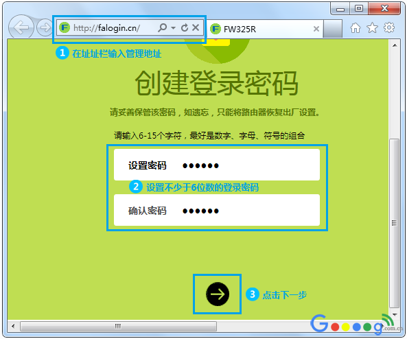 如果初次登录界面需要设置路由器的新管理密码,请务必牢记。设置密码后,点击“下一步”: