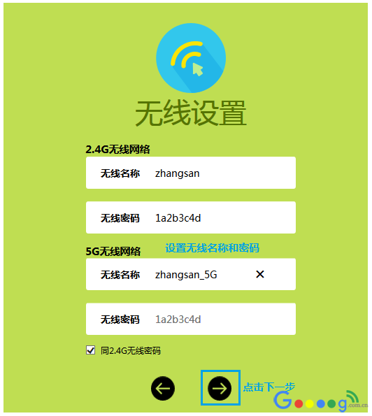 分别设置2.4G和5G的“无线名称”和“无线密码”,无线名称 建议使用数字、字母组合,请勿使用中文或特殊字符,设置8位及以上的无线密码。点击“下一步”: