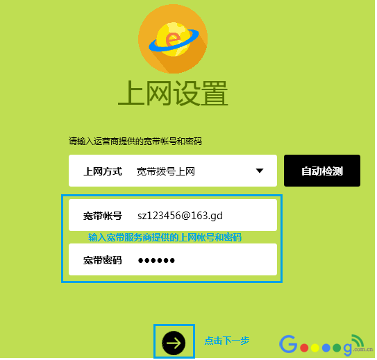 路由器会自动检测上网方式,确认上网方式后,请输入运营商提供的宽带帐号和密码,点击“下一步”: