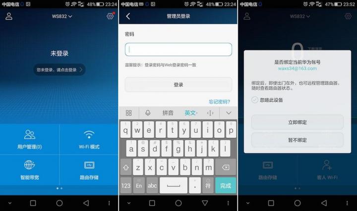 当你第一次设置路由器时,华为路由器WS832是发送一个没有密码的Wi-Fi可以直接连接,然后你就可以根据提示一步一步的修改用户名和密码了。再次登陆的时候,按照弹出提示框输入密码后,会提示你是否绑定华为账号,我一般都选择绑定,方便远程操控。