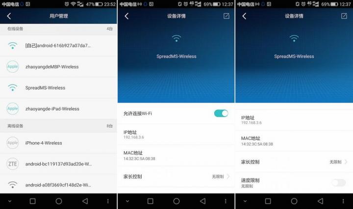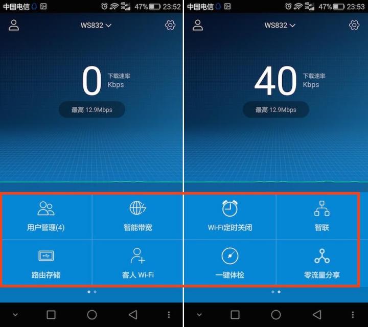 HiLink APP有“用户管理、智能宽带、路由存储、客人Wi-Fi、Wi-Fi定时关闭、智联、一键体检和零流量分享”的八大特色功能。其中,大家最关注的莫过于防止蹭网-用户管理。