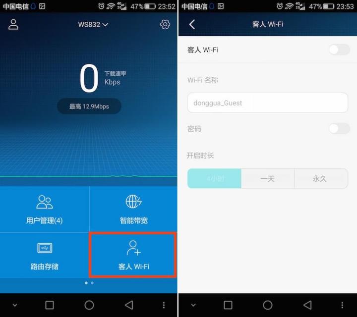 路由存储在上方已经说过,外接移动硬盘可以存储影片。接下来这个客人Wi-Fi功能简直是不二神器,毕竟家里的路由不可能天天换用户名和密码,来的客人究竟装了什么软件我们也不得而知;特别是有些亲戚愿意装免费Wi-Fi这种流氓类APP,如果你不想让你的网速变成大家公用,当来客人的时候可以开启客人Wi-Fi,同时你还能给这个Wi-Fi设定时常,时间一到自动关闭,真的是太贴心了。