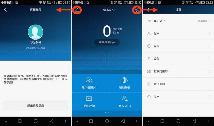 从主界面左上角可以进入远程登录,登陆之后,不在家你也能控制路由器;而右上角是设置路由器名称、账号密码等一般性功能,不做过多介绍。下面将重点说说HiLink APP的特色功能: