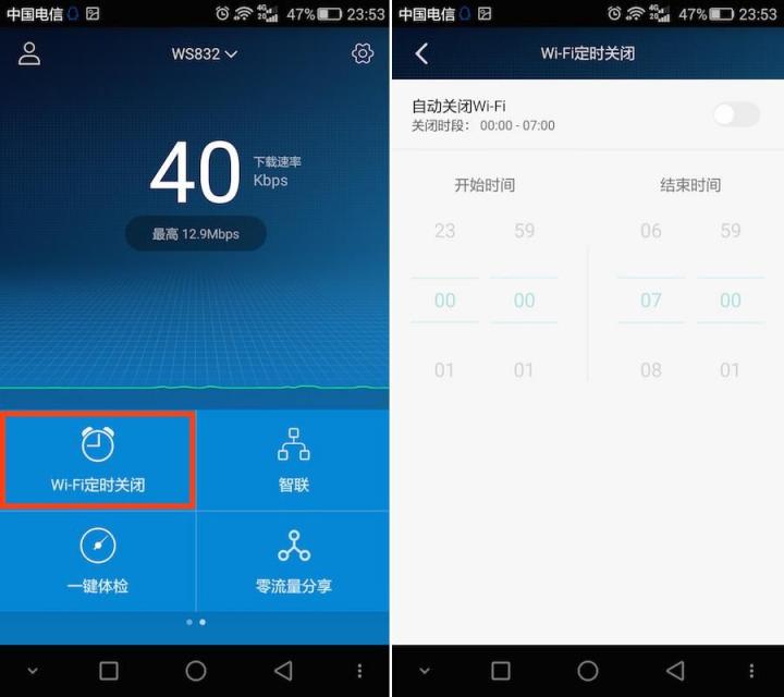 类似贴心的功能还有Wi-Fi定时关闭,该功能简直是为了我这种网络重度依赖症患者量身打造的。相信很多朋友都和我一样,睡前喜欢看个电影或者小说,然后睡觉的时候已然凌晨1点多,自动关闭Wi-Fi功能可以提醒你该睡觉了,并且半强制性的帮助你入睡,华为路由器WS832和HiLink的组合真的是完美!看了这么多贴心功能的你,想必对华为路由器WS832有相当程度的了解,信号好可穿墙、双通道不***、软件管理轻松便利、HiLink功能实用贴心,这样的路由器值得拥有!