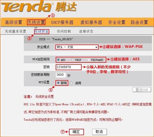 3、点击 无线设置 无线安全 WPS设置 选择:禁用 安全模式 选择:WPA-PSK WPA加密规则 选择:AES 设置 密码 ,这里的密码就是无线WiFi的连接密码,至少8位 点击 确定 。