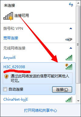来,图中指的已经很明显了,打开你的wifi开关图标,找到你的路由器的wifi信号,找到没有带“锁”的信号连接 注意一下:新路由器的WIFI名称是:品牌+随机字母和数字,默认是没有密码的。除部分牌子产品自带有密码