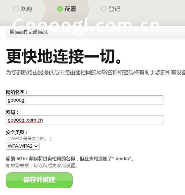进入无线配置界面,在网络名称中输入你需要设置的WIFI名称;密码为WIFI密码;设置好后,保存并继续。