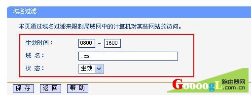 2、在“生效时间”后面填写0800-1600—->“域名”后面填写“.cn”—->“状态”后面选择“生效”—->“保存”。