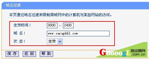 2、“生效时间”默认是0000-2400,表示0-24点,即所有时间禁止访问,这里不需要修改—->在“域名”后面输入xuexila.com—->在“状态”后面选择“生效”—->“保存”。