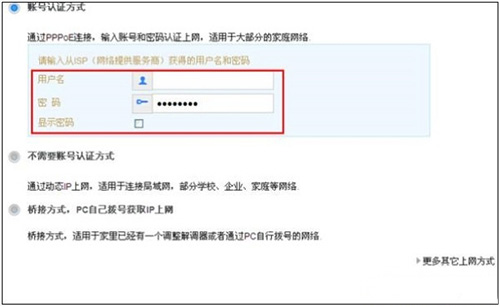 可以看到,这里有 自动探测上网方式、账号认证方式、不需要账号认证方式、桥接方式 PC自己拨号获取IP上网 4个选项;具体选择哪一个?这个问题是由用户办理的宽带类型、或者是用户路由器的安装网络环境来决定的,下面告诉大家如何进行选择。