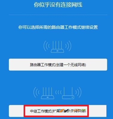 二:在下面的页面中,选择工作模式:中继工作模式(扩展现有的无线网络) ;此处就是把这个路由器当作一个无线扩展器来使用。