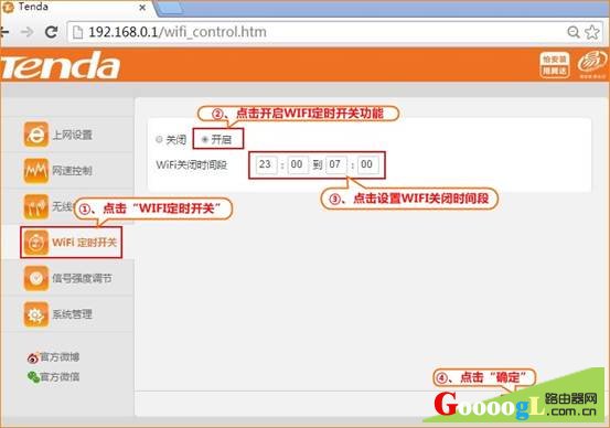第二步:在路由器左侧菜单中点击“WIFI定时开关”,在打开的页面中进行相应设置,参考如下操作步骤: