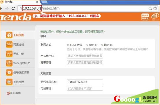 本文档适用于需要WIFI定时开关的用户 Q:WIFI定时开关有什么作用?如何设置? A: WIFI定时开关,就是用户根据自己的意愿设置WIFI在规定时间内处于开启/关闭状态。 具体设置步骤: 第一步:在浏览器中输入:192.168.0.1 按回车键,登录到路由器设置界面,如下图: