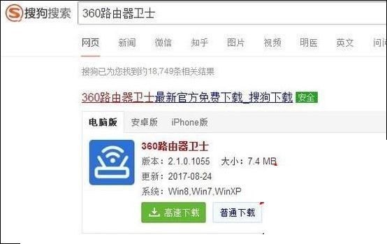 1、使用搜狗搜索下载360路由卫士,如图,进行下载。