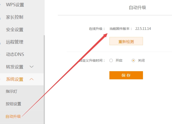 进入高级设置->系统设置——自动升级。当前固件版本:22.5.11.14;点击重新检测,之后会出现需要更新的固件信息,如果需要自动升级,请点击下面的在线升级按钮。此时你的网络必须是畅通的才能保证升级成功。