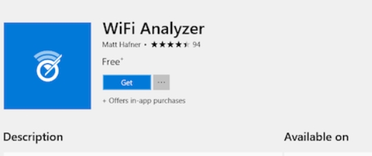 Windows 10:在Windows Store中找到一个名为WiFi Analyzer的免费应用程序。如果您由于不在PC上而无法单击该链接,只需直接在Cortana搜索栏中键入wifi analyser,它就会出现。点击进入商店页面进行下载。
