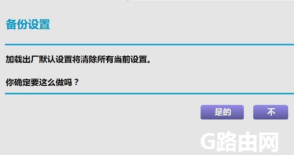 每台路由器都会有一个reset重置按钮,位于路由器背面网口旁的圆形按钮。reset按钮可以一键让路由器恢复出厂设置,重置后的路由器需要重置配置上网信息,参考G路由网之前发布的【】。