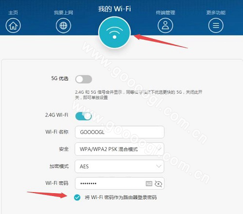 无线密码修改:找到顶部主菜单【我的WIFI】,可以修改包括2.4G和5G无线名称和密码。