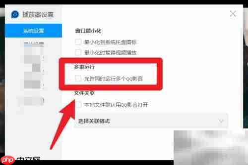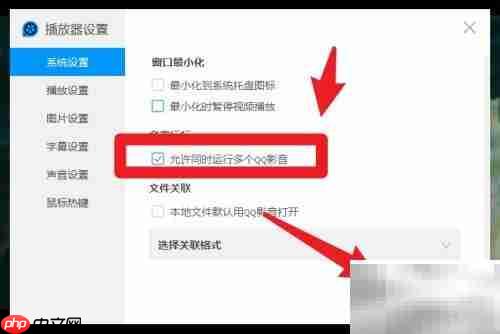 5、 在系统设置窗口中,找到并勾选“允许同时运行多个QQ影音”选项,然后点击底部的“确定”按钮保存设置。